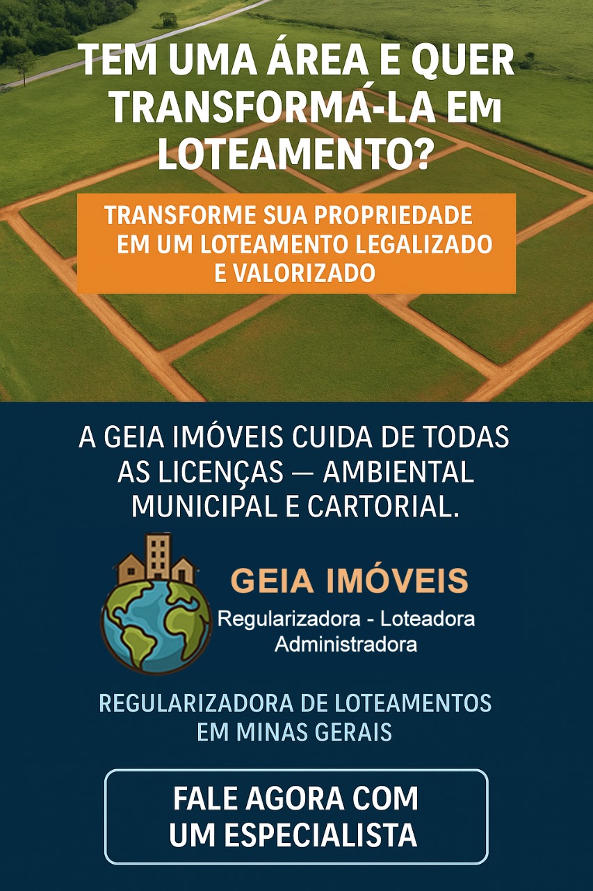 GEIA IMÓVEIS está efetuando a descaracterização de imóvel rural para urbano e o parcelamento da área em 24 lotes, cada um com 15m de frente para a Rua Capitão Chaves de Miranda, com áreas que variam entre 531m2 e 1061m2. A érea tem vista fantástica para a Serra de São José e tão logo esteja o parcelamento registrado no Cartório de Imóveis, será lançado o empreendimento para vendas. Acompanhem nas mídias GÉIA IMÓVEIS o lançamento, oportunidade para um ótimo negócio.